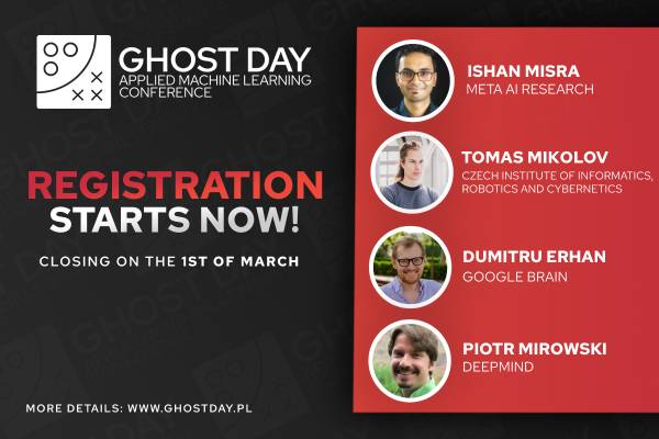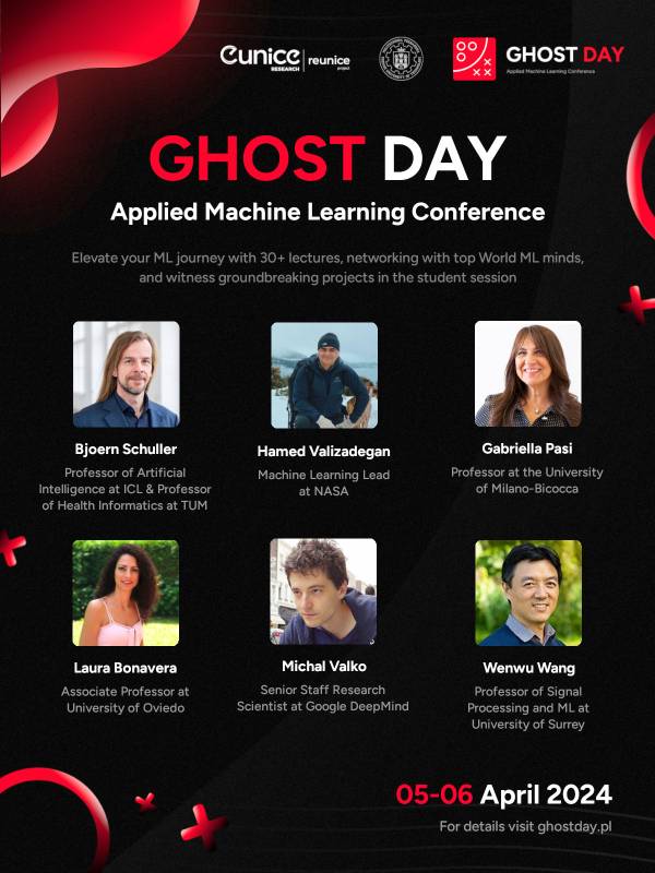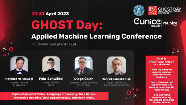 GHOST Day: Applied Machine Learning Conference to jedna z największych konferencji o sztucznej inteligencji w Polsce! Na wydarzeniu będzie szansa posłuchać specjalistów z topowych firm i ośrodków badawczych - Meta, Google DeepMind, Mistral AI, Qualcomm AI Research, CuspAI, University of Amsterdam, Technical University Berlin oraz wielu innych. Ogłoszenia można śledzić na mediach społecznościowych GHOST Day: AMLC oraz stronie ghostday.pl.